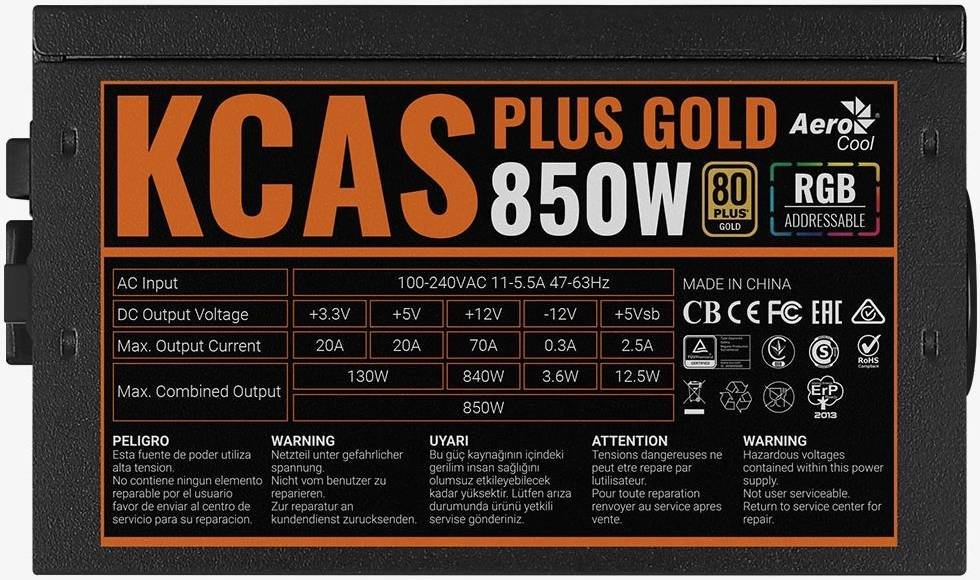 Aero Cookl KCAS PLUS GOLD 850W ARGB Power Supply, 80Plus Gold Certified for up to 92%+ Efficiency, 120mm High-pressure Fan with Speed Control, 105°C Japanese Capacitors & APFC, Black