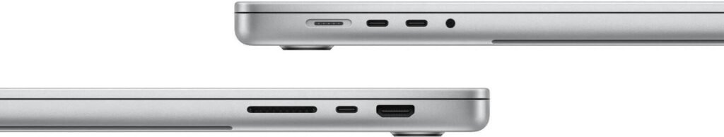 - Three Thunderbolt 5 ports, HDMI port, SDXC card slot, headphone jack, MagSafe 3 port