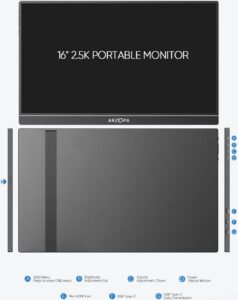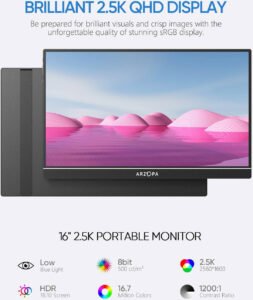 ARZOPA Z1RC Portable Monitor, 16″ IPS Display, 2.5K QHD Resolution, 60Hz Refresh Rate, 1.07G Display Color, Low Blue Light, HDR, Built-in Speakers, Built-in Stand, Black
