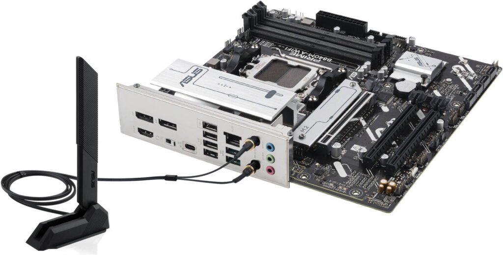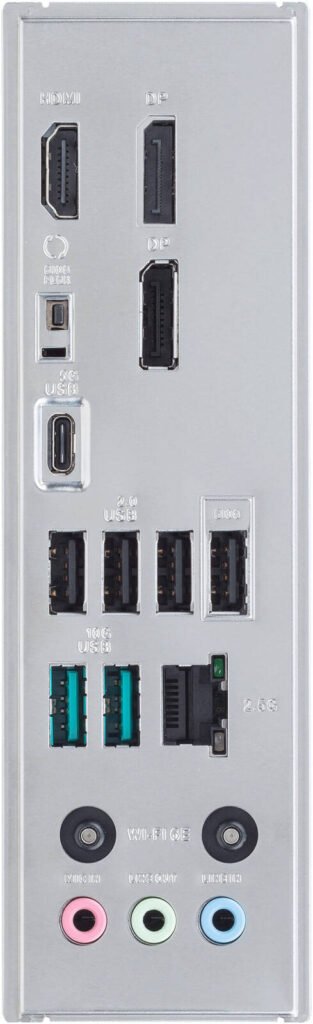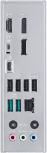 | Back Panel I/O | 2 x USB 10Gbps (Type-A), 1 x USB 5Gbps (Type-C®), 4 x USB 2.0 (Type-A), 2 x DisplayPort, 1 x HDMI™, 1 x Wi-Fi module, 1 x Ethernet, 3 x Audio jacks, 1 x BIOS FlashBack™ button. |
