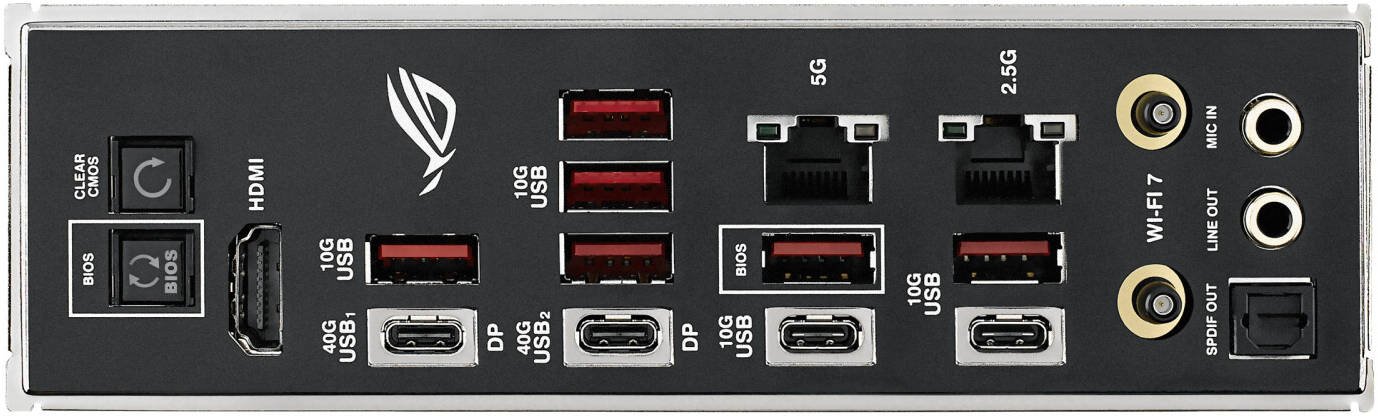 | Back Panel I/O | 2 x USB4, 8 x USB 10Gbps, 1 x HDMI, Wi-Fi module, 2 x LAN, 2 x Audio jacks, S/PDIF, BIOS FlashBack, Clear CMOS |