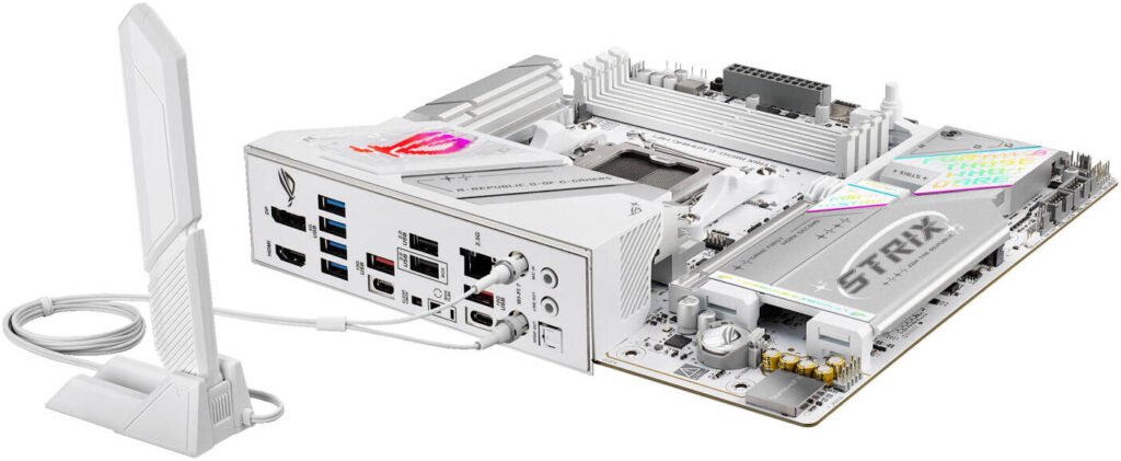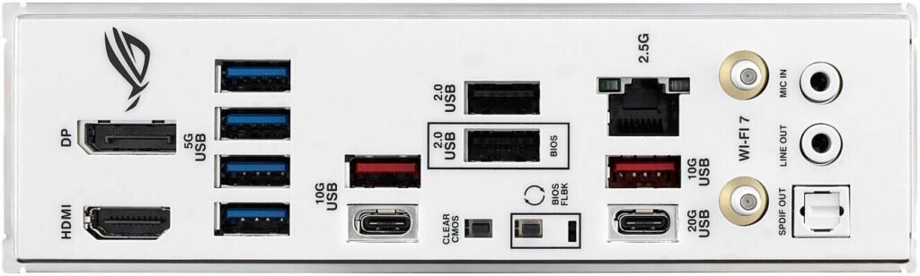 | Back Panel I/O | USB ports above; DisplayPort; HDMI; Wi-Fi module; 2.5Gb LAN; audio jacks; optical out; BIOS FlashBack; Clear CMOS |