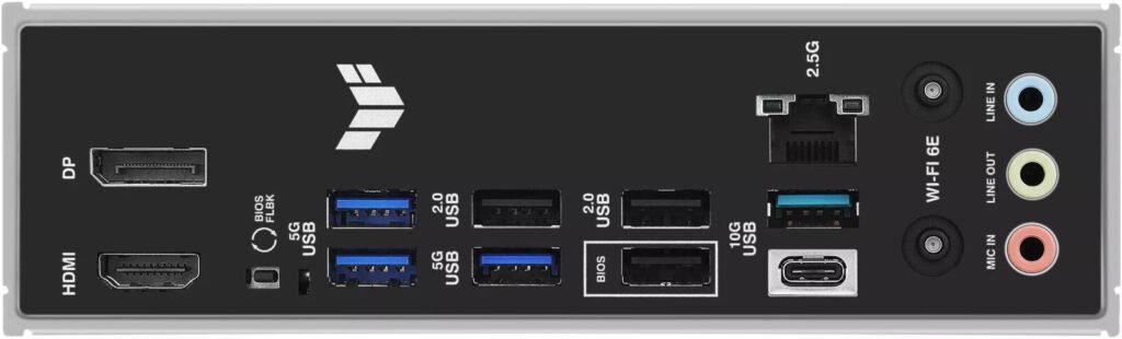 Back Panel I/O USB ports above; DisplayPort; HDMI; Wi-Fi module; 2.5Gb LAN; 3× audio jacks; BIOS FlashBack