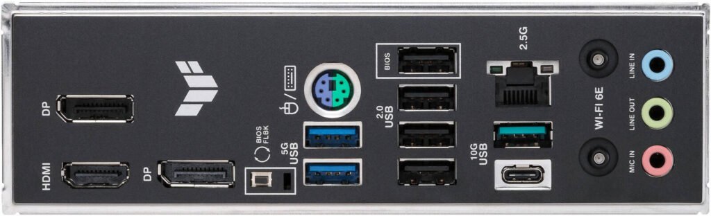 | Back Panel I/O | 2 × USB 10Gbps (1 × Type-A, 1 × Type-C), 2 × USB 5Gbps (Type-A), 4 × USB 2.0 (Type-A), 2 × DP, 1 × HDMI, 1 × Wi-Fi module, 1 × 2.5Gb LAN, 3 × audio jacks, BIOS FlashBack™, PS/2 combo |