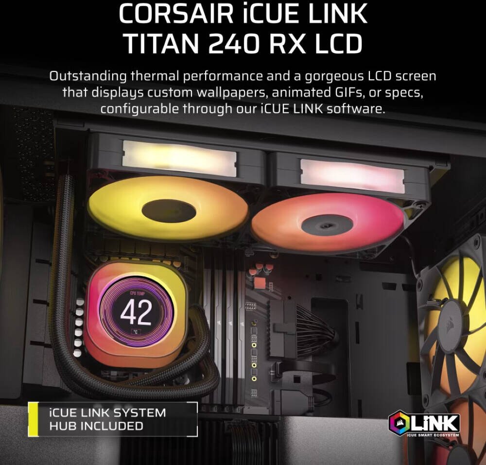 Corsair iCUE LINK TITAN 240 RX LCD AIO Liquid CPU Cooler, Customizable LCD Screen, Compatible With Intel Socket LGA 1851, 1700, AMD AM5, AM4, Addressable RGB, Extreme Cooling, Black