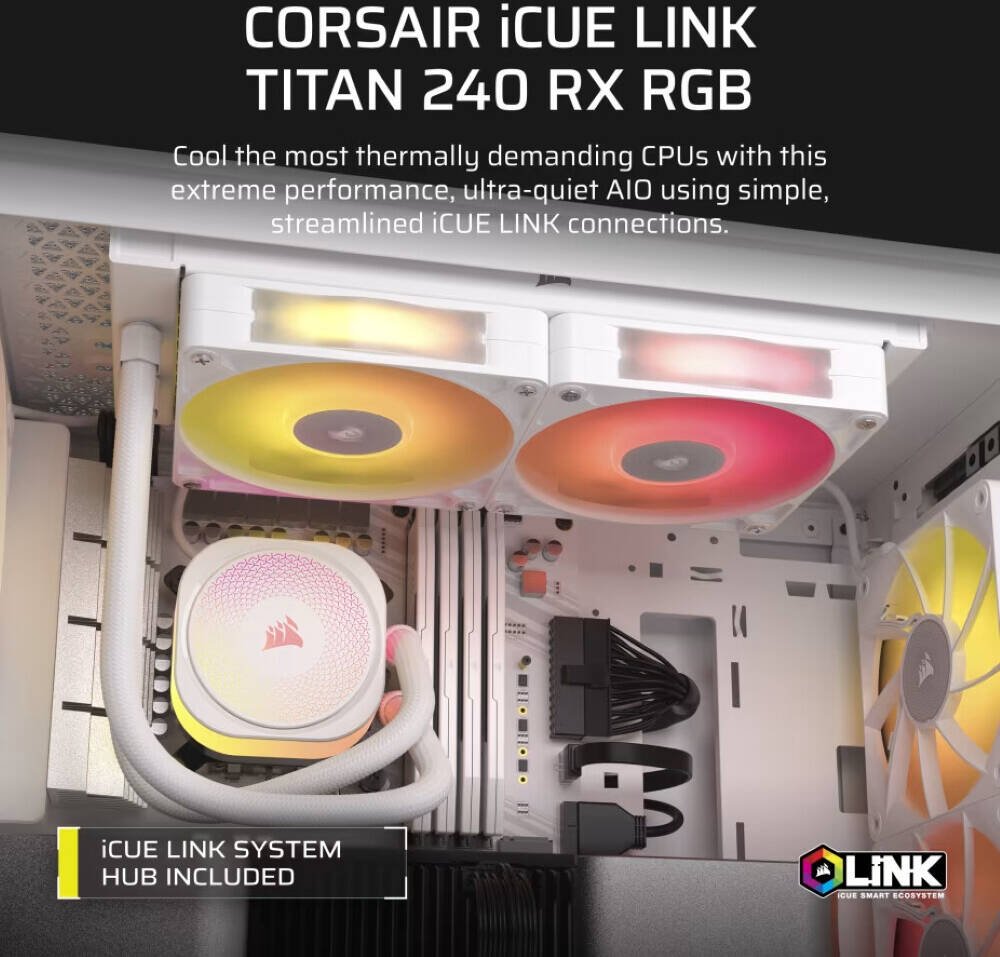 Corsair iCUE LINK TITAN 240 RX RGB AIO Liquid CPU Cooler, Compatible With Intel Socket LGA 1851, 1700, AMD AM5, AM4, Addressable RGB, Extreme Cooling Performance, White