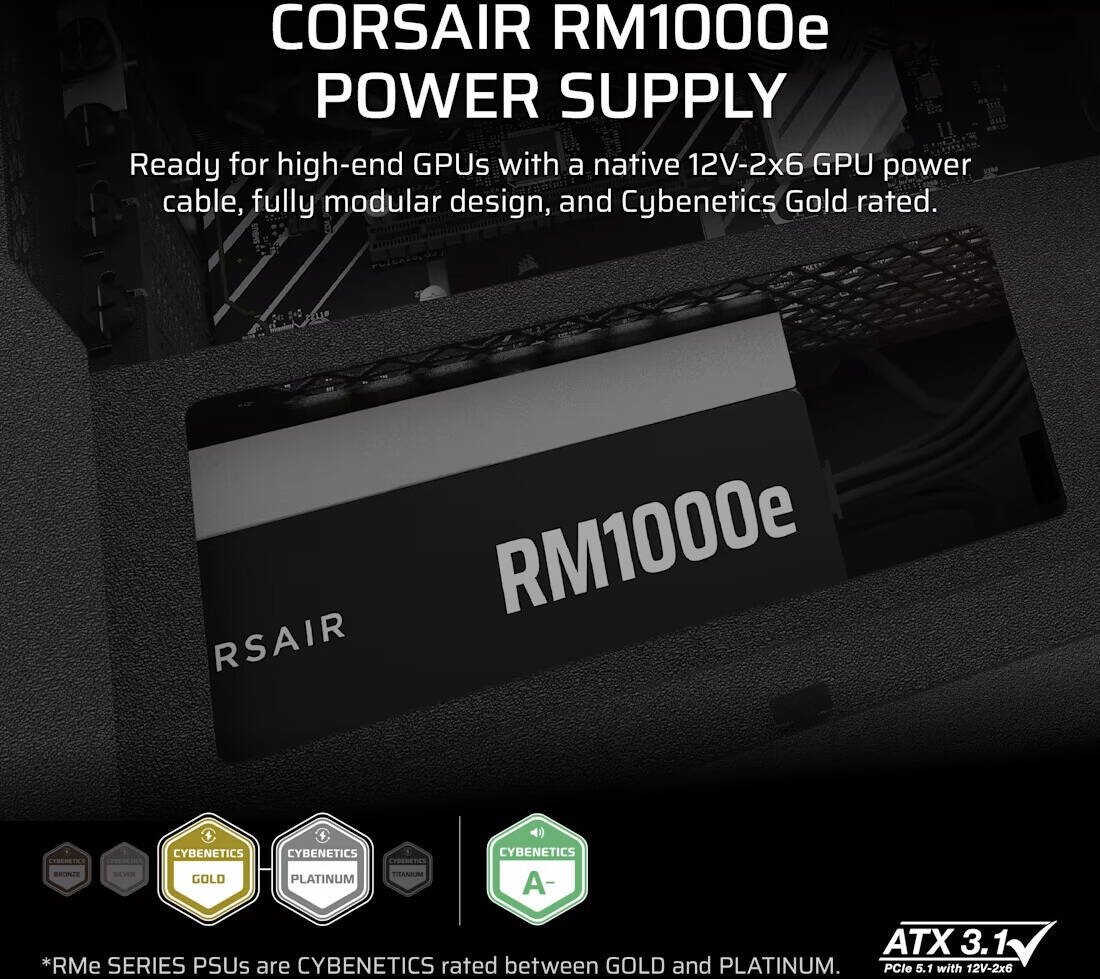 Corsair RMe Series RM1000e V3 Fully Modular Low-Noise ATX Power Supply, 1000W Power, 80 PLUS Gold Efficiency, 120mm Rifle Bearing Fan, Zero RPM Fan Mode, ATX 3.1 Certified, Black