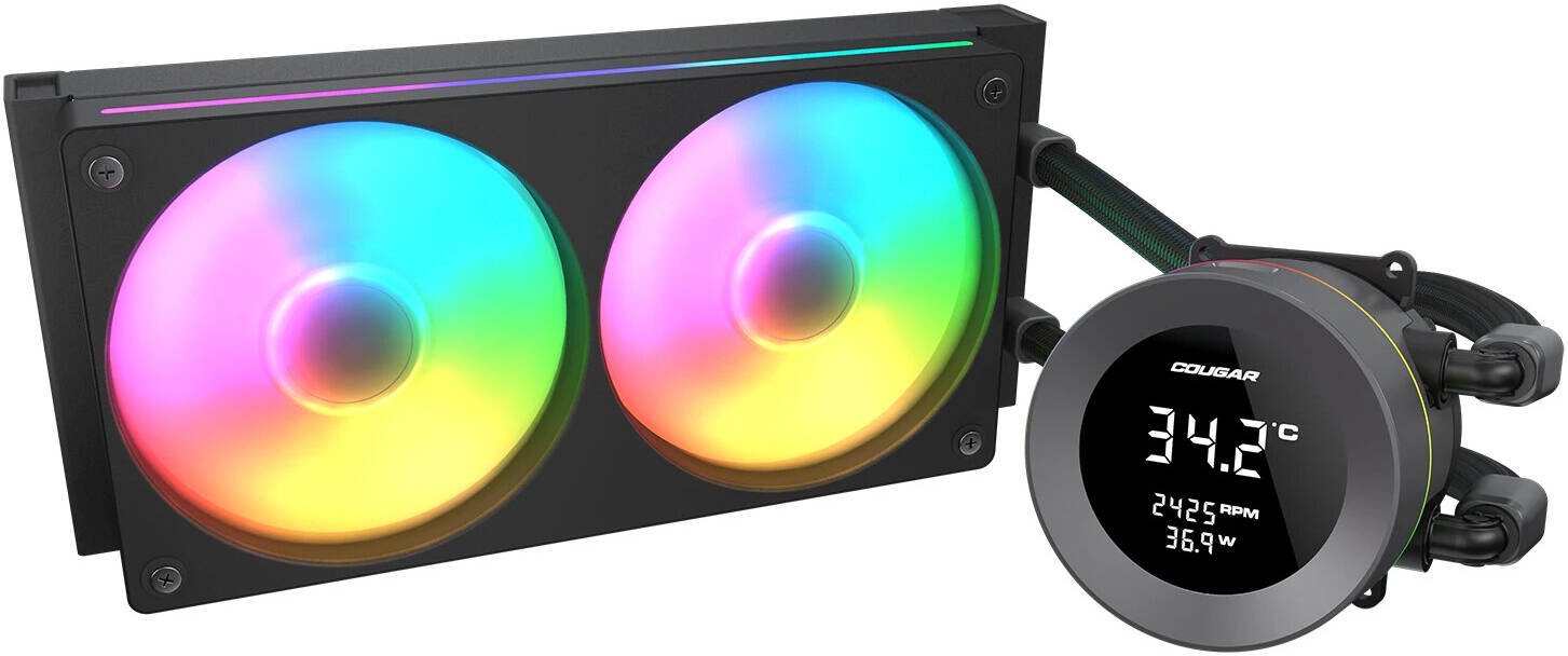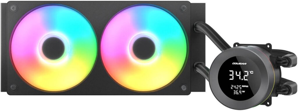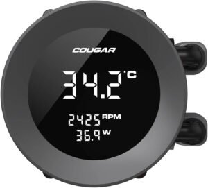 Cougar Poseiden Vistek ARGB 240 Liquid CPU Cooler, 1.9″ Digital Display, Single-Frame PWM Fans, 2500 RPM Fan Speed, 78.2 CFM Fan Airflow, Copper Cold Plate, Black