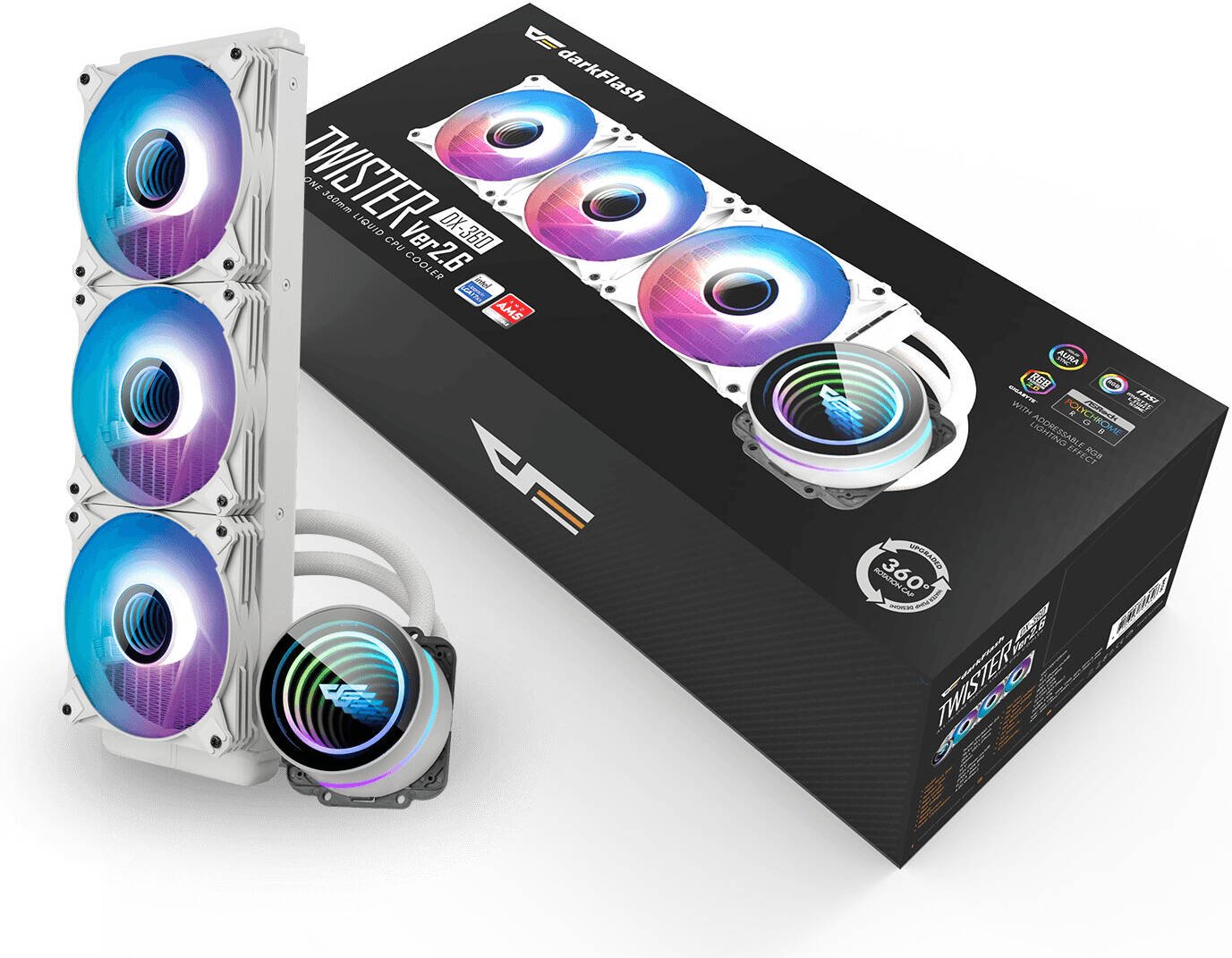 darkFlash Twister DXV2.6 360 Liquid CPU Cooler, ARGB 120mm PWM Fans with 1800 RPM Speed, ARGB M/B Sync, Infinity Mirror With 360 Degree Rotation, Support Intel / AMD, White