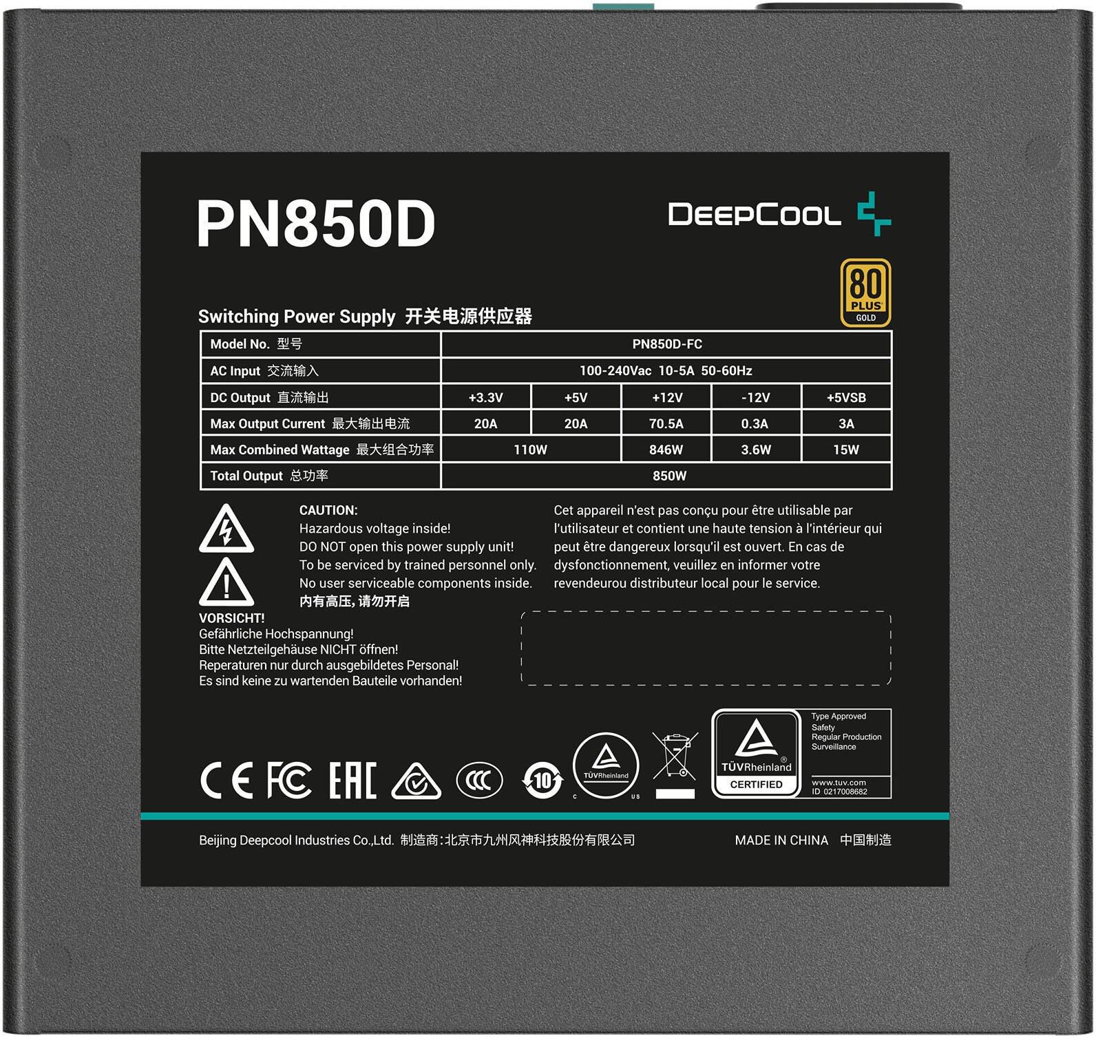 DeepCool PN850D Non-Modular Power Supply, 850W Power, 80 Plus Gold Certified, Active PFC + Full Bridge SRC LLC + DC to DC, Hydro Bearing, 120mm Fan Size, Black