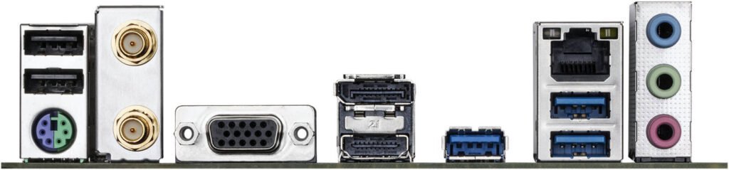 | Back Panel | 2× USB 2.0, 1× PS/2, 2× SMA antenna, 1× D-Sub*, 1× HDMI*, 1× DisplayPort*, 3× USB 3.2 Gen1, 1× RJ-45, 3× audio jacks (*support depends on CPU) |