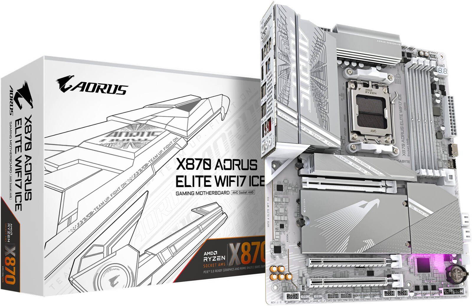 GIGABYTE X870 Aorus Elite WiFi7 Ice AM5 ATX Motherboard, AMD X870 Chipset, 4x DDR5 DIMM Slot, 256GB Max Memory, 4x M.2 Slots, 1x PCIe 5.0 x16, White