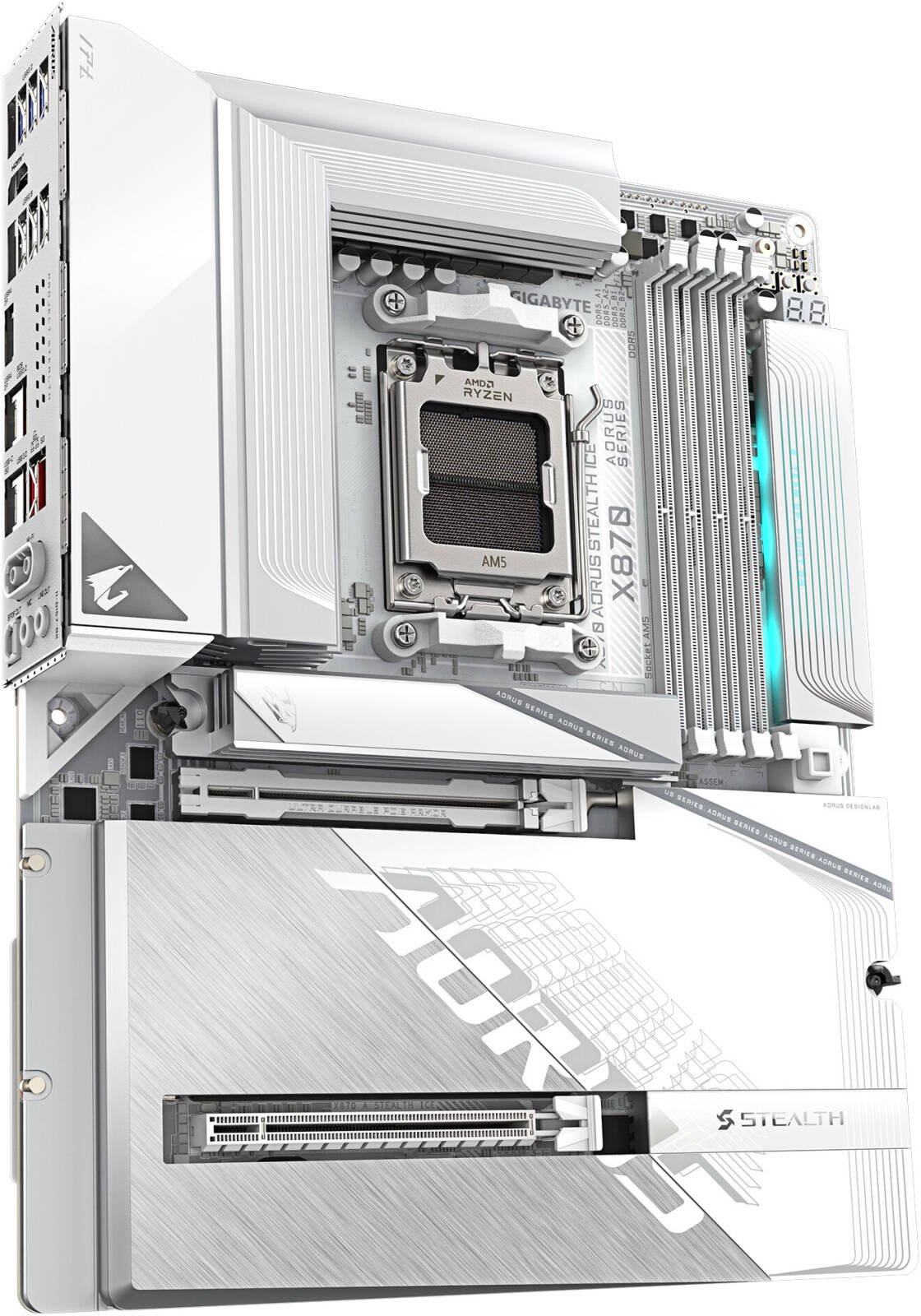 GIGABYTE X870 AORUS STEALTH ICE AM5 ATX Motherboard, AMD X870 Chipset, 4x DDR5 DIMM Slots, 256GB Max Memory, 1x PCIe 5.0 x16, 4x M.2 Slots, WIFI 7 & BT 5.4, White