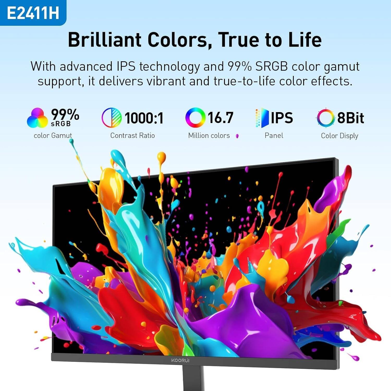 KOORUI E2411H Office Monitor, 24″ IPS Display, FHD Resolution, 120Hz Refresh Rate, 6ms Response Time, AMD FreeSync Premium Technology, Flicker-Free, 16.7m Color Display, Black