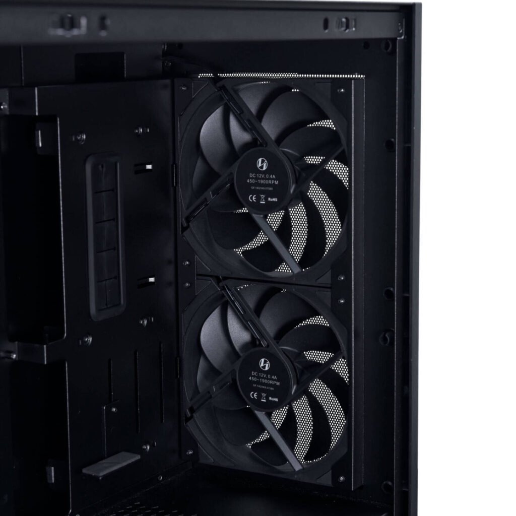 - Included 2 x 140mm PWM fans at the front, and 2 x 120mm PWM fans at the bottom