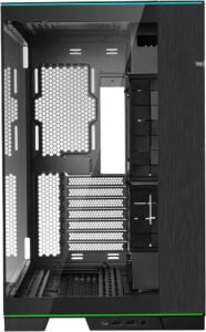 - Front and side tempered glass panels with a removable pilar for a seamless view of components and RGB lighting.