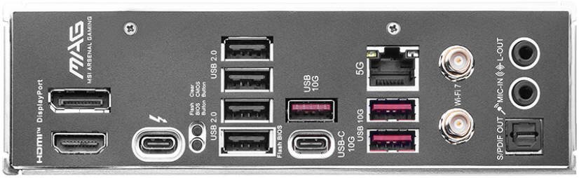 Back Panel Ports DisplayPort, HDMI, USB 2.0, USB 10Gbps (Type-A & Type-C), 5G LAN, Wi-Fi/Bluetooth, Thunderbolt™ 4, Flash BIOS Button, Clear CMOS Button, S/PDIF-OUT, Audio connectors