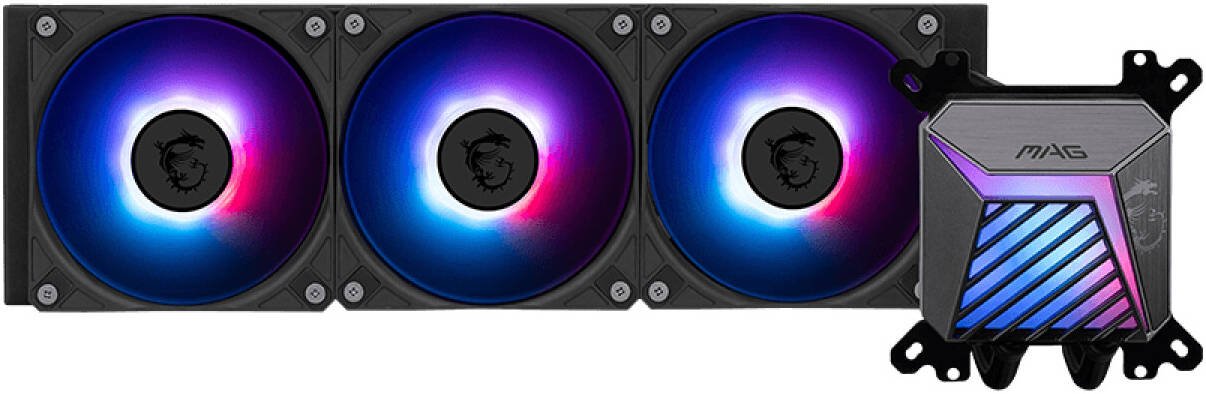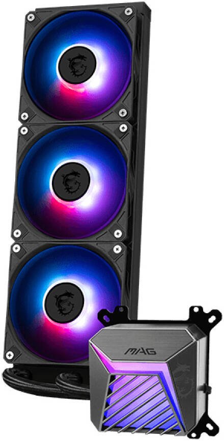MSI MAG CORELIQUID A15 Liquid CPU Cooler, 360mm Radiator, 3x 120mm Pre-installed Fans, 2050 RPM Fan Speed, 64.89 CFM Fan Airflow, Fan Rifle Bearing Type, Black
