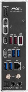 | Back Panel Ports | HDMI™, Thunderbolt™ 4, USB 10Gbps Type-C/A, S/PDIF, 5G LAN, Wi-Fi/Bluetooth, Flash BIOS Button, Clear CMOS Button |