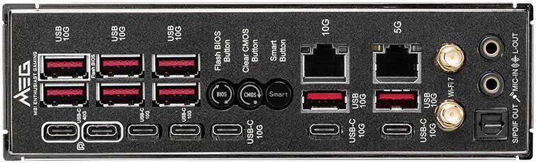 | Back Panel Ports | USB 10Gbps Type-A, USB 10/40Gbps Type-C, Flash BIOS, Clear CMOS, Smart Button, 10G/5G LAN, Wi-Fi/Bluetooth, HD Audio, Optical S/PDIF-Out |