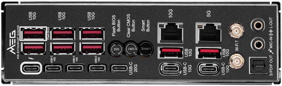 | Back Panel Ports | USB 10Gbps (Type-A), Flash BIOS, Clear CMOS, Smart Button, 10G LAN, 5G LAN, Wi-Fi / Bluetooth, HD Audio, Thunderbolt 4 (40Gbps Type-C), USB 10Gbps (Type-C), USB 20Gbps (Type-C), Optical S/PDIF-Out |