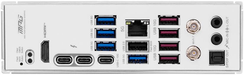 | Back Panel Ports | USB 5Gbps Type-A, USB 10Gbps Type-A, USB 10Gbps Type-C, USB 2.0, 5G LAN, Wi-Fi/Bluetooth, HDMI™, Thunderbolt 4, Optical S/PDIF Out, Audio Connectors, Clear CMOS Button, Flash BIOS Button |