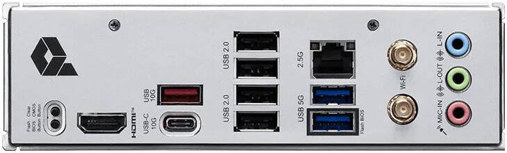 Rear Ports Clear CMOS Button, HDMI™, USB 10Gbps Type-A, USB 10Gbps Type-C, USB 5Gbps Type-A, USB 2.0, 2.5G LAN, Wi-Fi/Bluetooth, Audio connectors, Flash BIOS Button