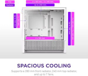 - Supports up to 280 mm front and 240 mm top radiators, plus 7 total fans.