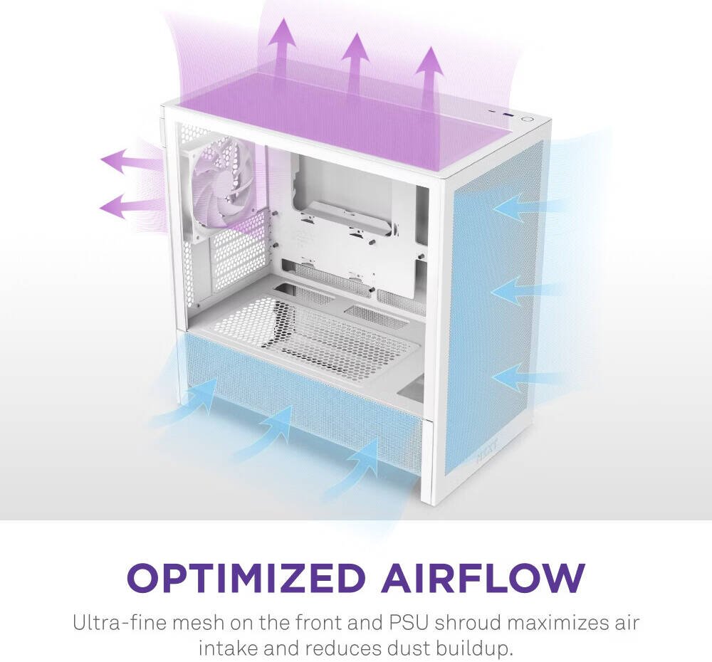 - High-airflow design with ultra-fine mesh panels and ventilated PSU shroud.