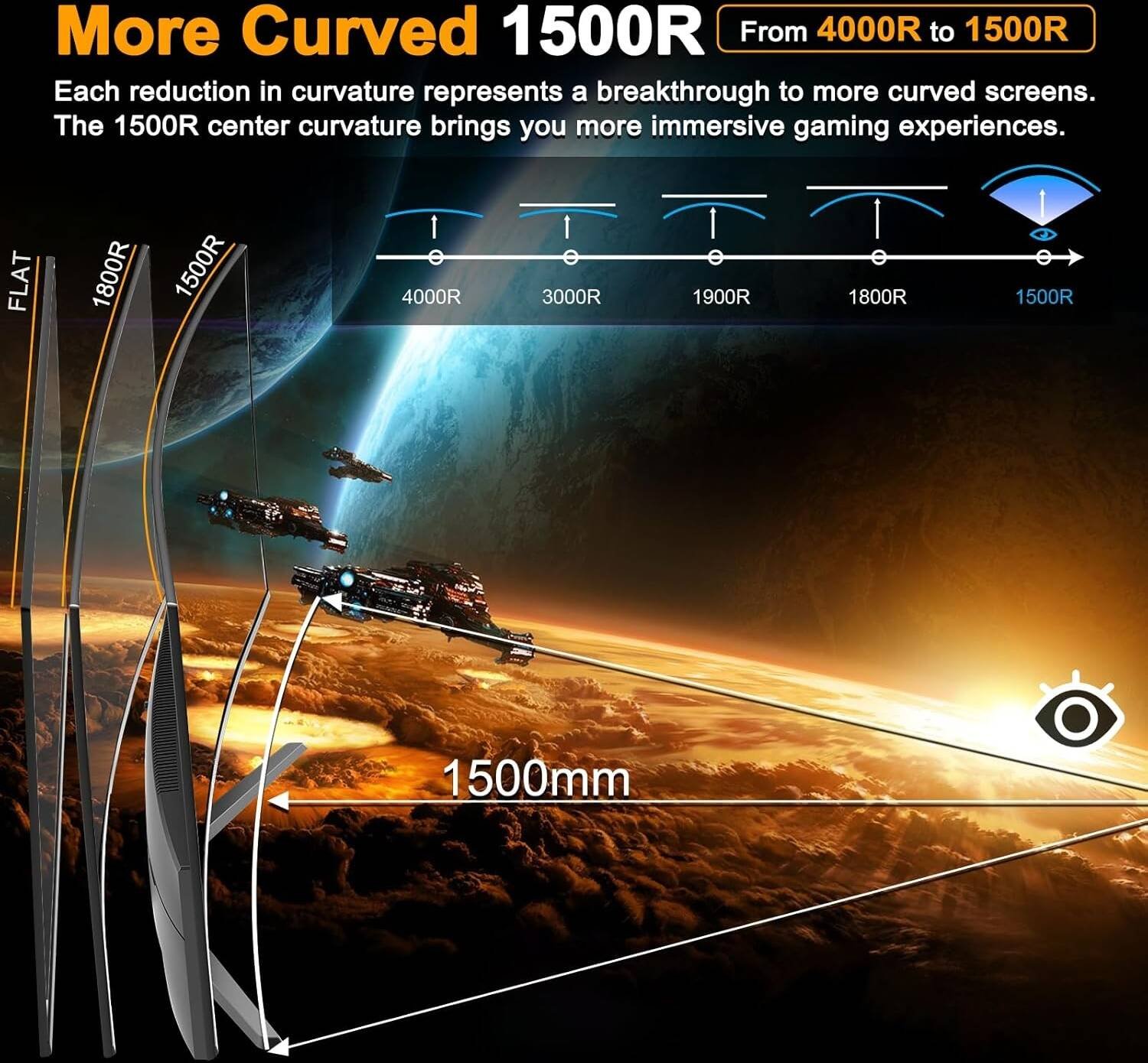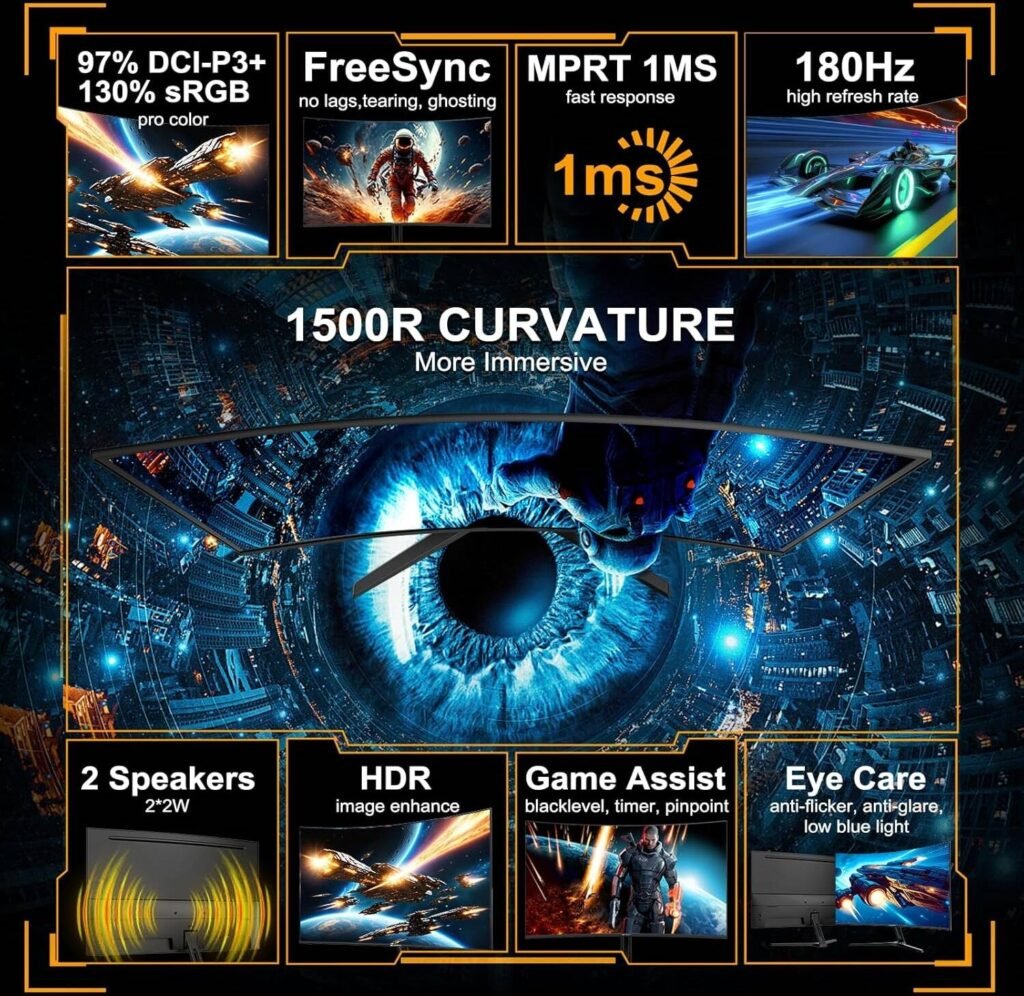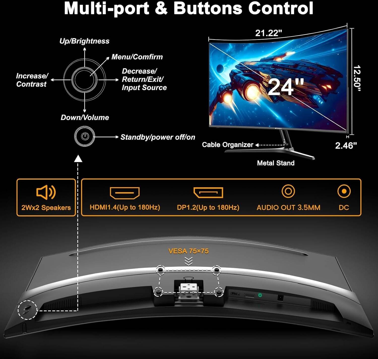 SANSUI ES-G24C1 Curved Gaming Monitor, 24″ Fast VA Display, FHD Resolution, 180Hz Refresh Rate, 1ms (MPRT) Response Time, 1500R Curvature