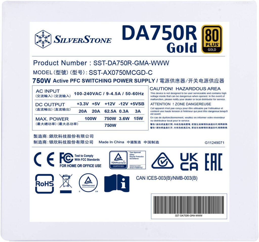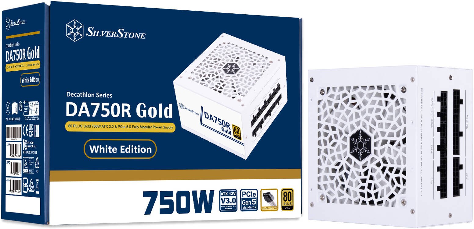 SilverStone DA750R Gold Fully Modular Power Supply, 80 PLUS Gold, 750W ATX 3.0 & PCIe 5.0, Active PFC, Silent 120mm FDB Fan, Japanese Capacitors, White