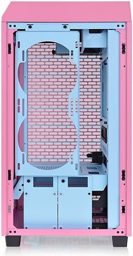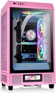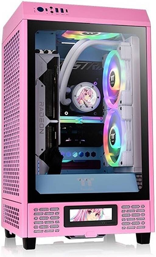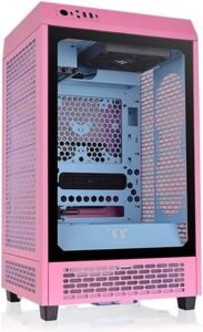 - The Tower 200 Bubble Pink is a mini-ITX case with a vertical case design that offers fantastic viewing. It comes with two pre-installed CT140 fans, each 140mm wide, for exceptional thermal efficiency. It also has enough space for a 4090 GPU and a standard-size PSU, fitting all your high-end components. Moreover, The Tower 200 Bubble Pink is compatible with a separately sold LCD panel kit with a 3.9″ LCD display to maximize the PC’s visual effects to its full potential.