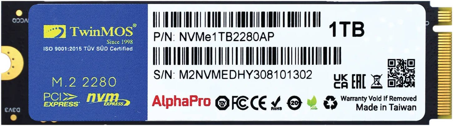 TwinMOS AlphaPro PCIe NVMe Gen 3.0×4 SSD, 1TB Capacity, M.2 2280 Form Factor, Up to 3600 MB/s Read & 3250 MB/s Write, TLC 3D NAND, 1000TB Endurance, Black