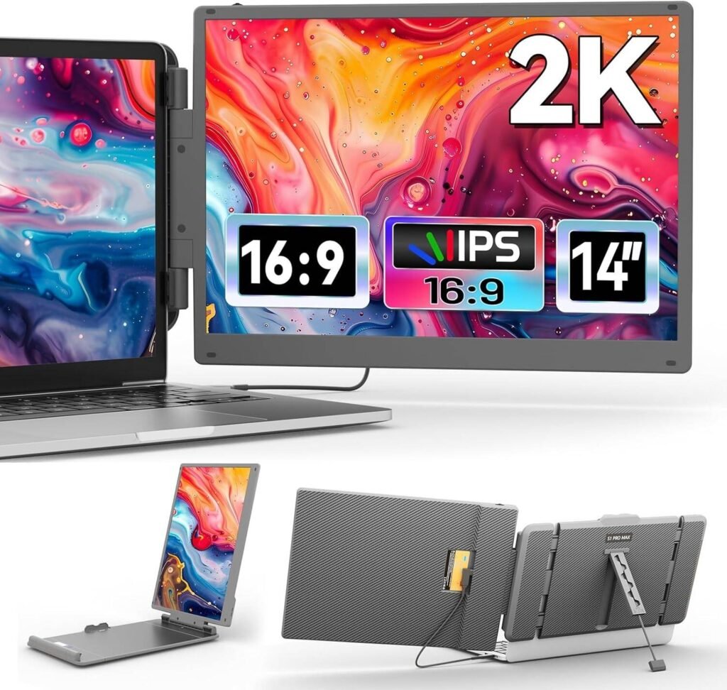 V2COM 14″ 2K Dual Laptop Screen Extender, Portable 2160 x 1440 IPS Monitor with Type-C/HDMI/USB-A Plug and Play, Fits 13-17″ Laptops, Compatible with Windows/Mac/Android