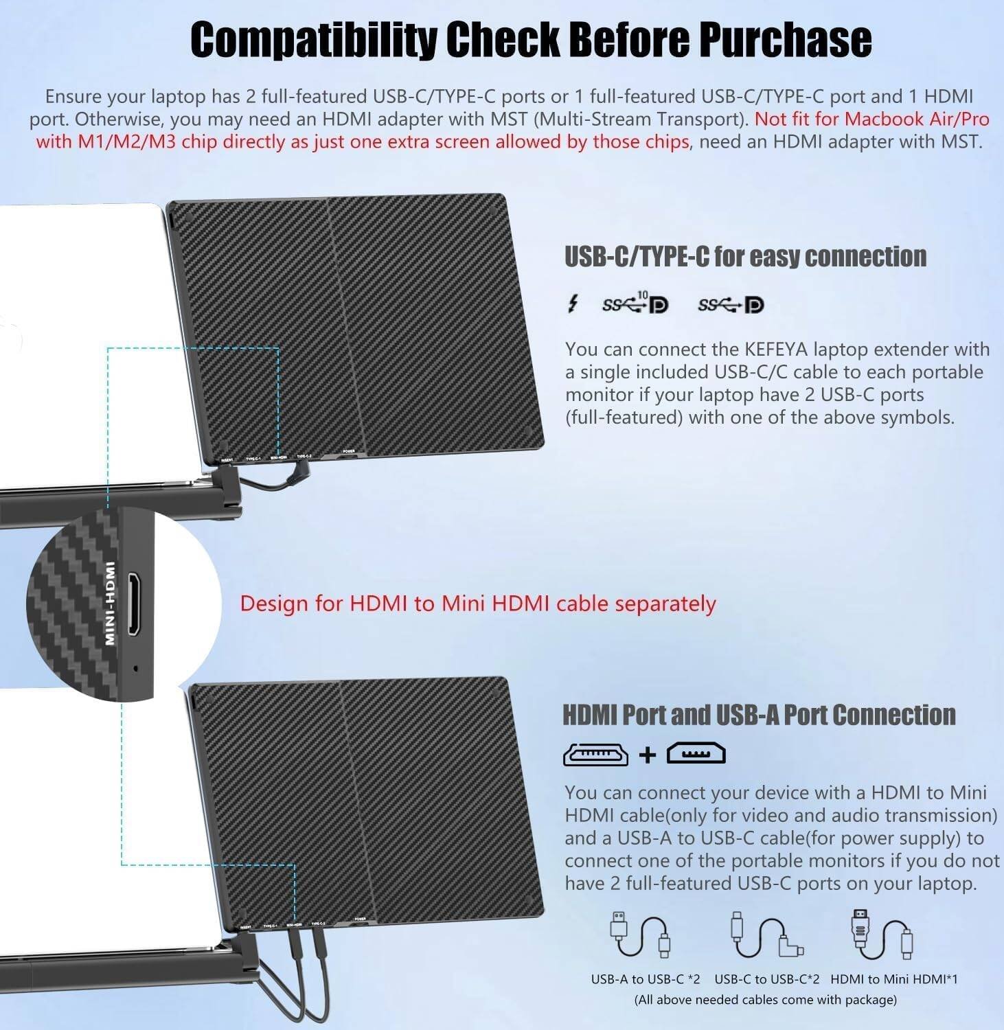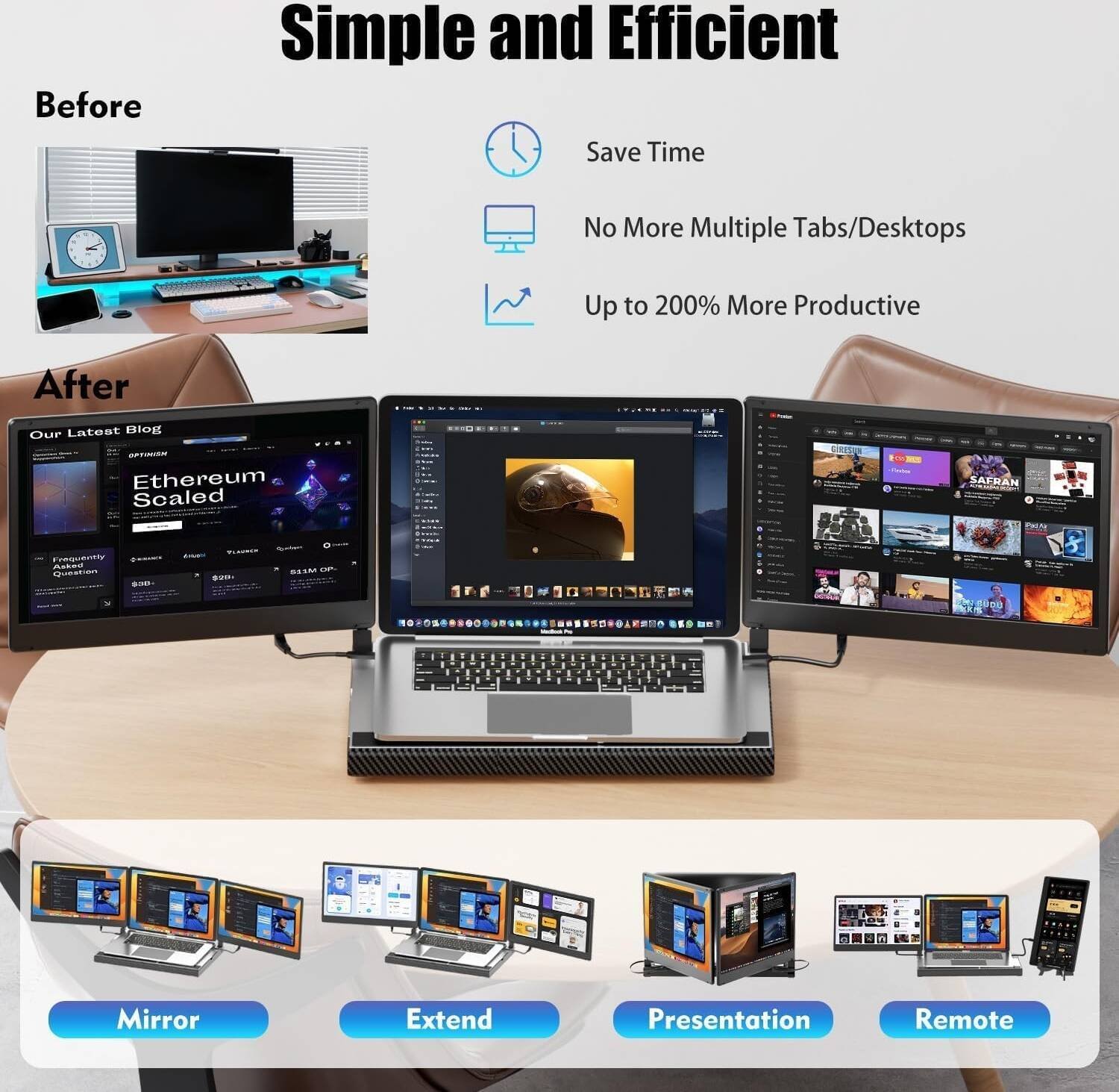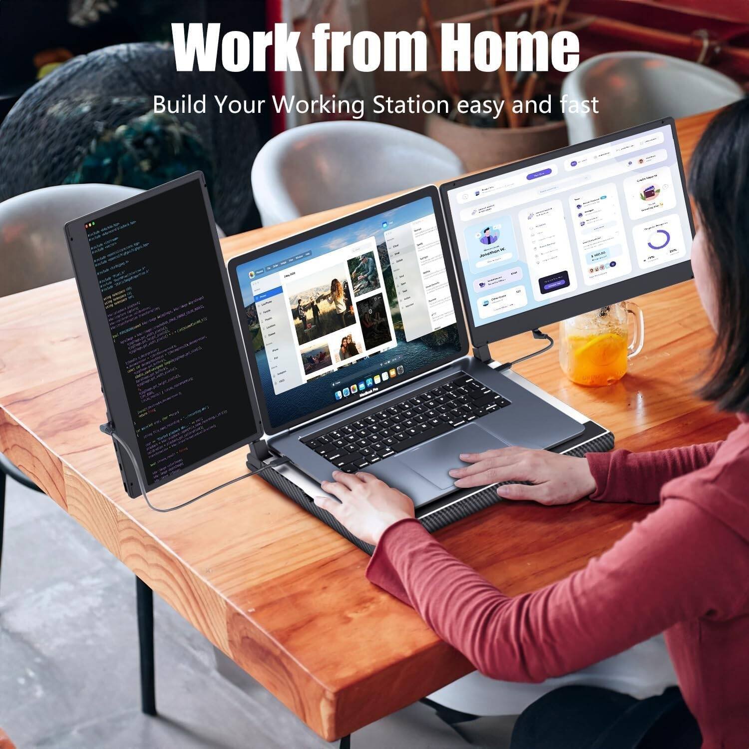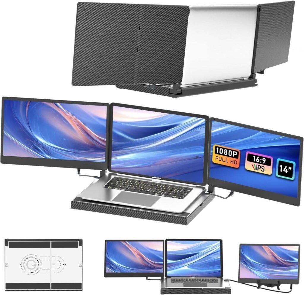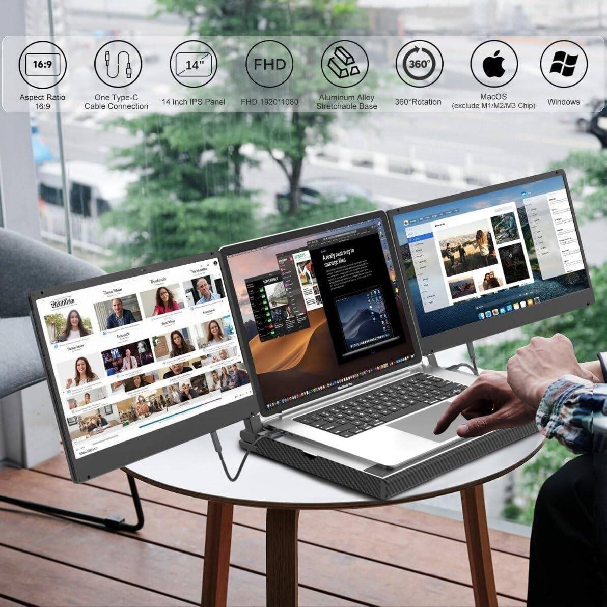 V2COM F3 14” Triple Laptop Monitor Extender with Aluminum Base, 360° Rotation, 1080P FHD IPS Display for 12-17” Laptops, Plug & Play, Adjustable Stand