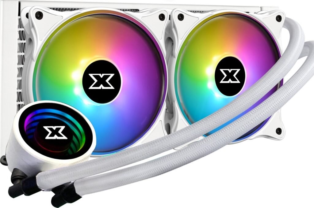 XigmaTek Aurora Arctic 240 Illuminated Pump Head, 2xAT120 Fan, Metal Backplate AIO Liquid Cooler – White